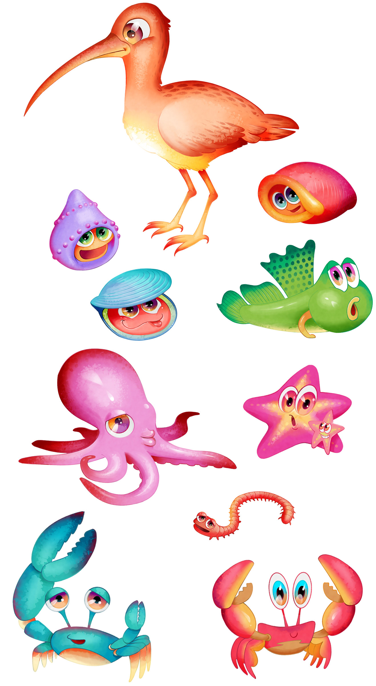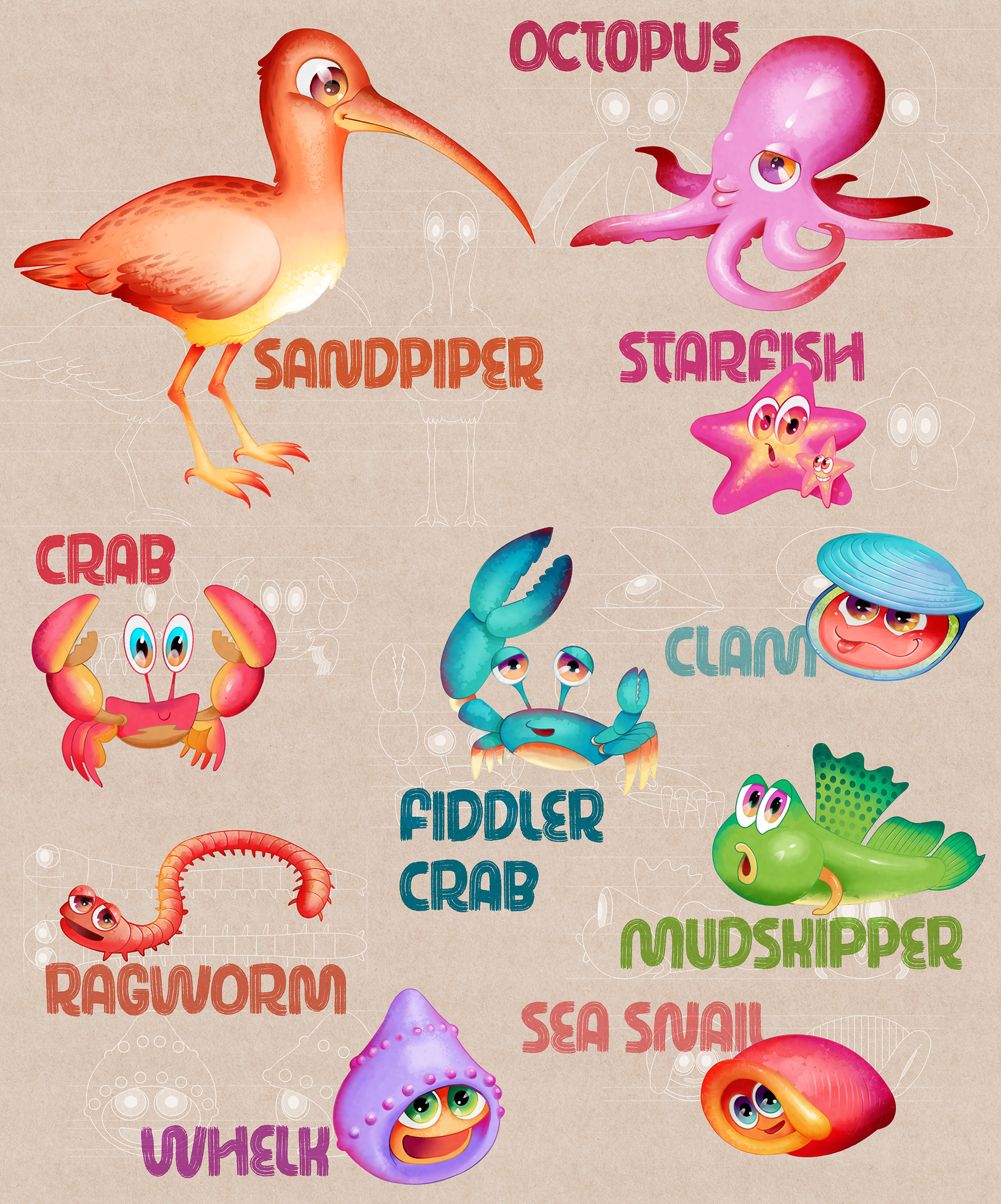 Animation characters based on creatures living in mudflat ecosystem.